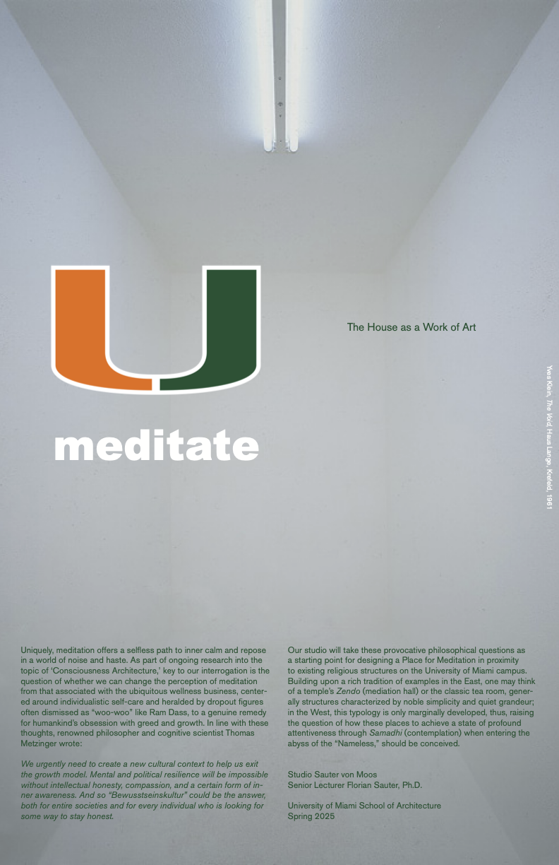 ARC 407-510-609: Meditate Uniquely, meditation offers a selfless path to inner calm and repose in a world of noise and haste. As part of ongoing research into the topic of “Consciousness Architecture,” this studio questions whether we can shift the perception of meditation—from its current association with the commercialized wellness industry and individualistic self-care, often personified by figures like Ram Dass—to a genuine remedy for humankind’s obsession with greed and growth. In alignment with these ideas, philosopher and cognitive scientist Thomas Metzinger wrote: “We urgently need to create a new cultural context to help us exit the growth model. Mental and political resilience will be impossible without intellectual honesty, compassion, and a certain form of inner awareness. And so ‘Bewusstseinskultur’ could be the answer, both for entire societies and for every individual who is looking for some way to stay honest.” The studio takes these provocative philosophical questions as a point of departure for designing a Place for Meditation situated near existing religious structures on the University of Miami campus. Drawing inspiration from the rich traditions of the East—such as the Zendo (meditation hall) or the classic tea room, each defined by noble simplicity and quiet grandeur—students will explore how to reinterpret this spatial typology in a Western context, where it remains underdeveloped. The studio invites students to conceive spaces that facilitate profound attentiveness and contemplation, offering an architectural path toward what might be called the “Nameless.” Faculty: Florian Sauter Time: 1:30pm-5:00pm Location: Old Gallery