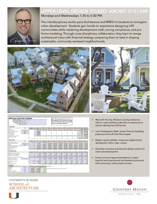 ARC 407-510-609: Upper-Level Design Studio This interdisciplinary studio pairs Architecture and MRED+U students to reimagine urban development. Students gain hands-on experience designing infill communities while mastering development math, zoning compliance, and pro forma modeling. Through cross-disciplinary collaboration, they learn to merge architectural vision with financial strategy—preparing them to lead in shaping sustainable, community-centered neighborhoods. Faculty: Geoffrey Mouen Time: 1:30pm-5:00pm Location: Korach Gallery North