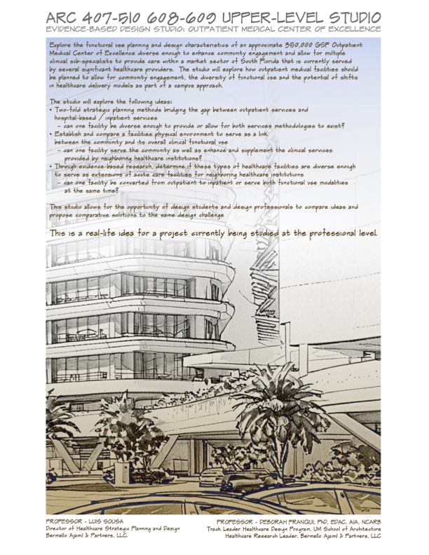 ARC 407-510-609: Outpatient Medial Center of Excellence Explore the functional use planning and design characteristics of an approximate 350,000 GSF Outpatient Medical Center of Excellence diverse enough to enhance community engagement and allow for multiple clinical sub-specialists to provide care within a market sector of South Florida that is currently served by several significant healthcare providers. The studio will explore how outpatient medical facilities should be planned to sllow for community engagement, the diversity of functional use and the potential of shifts in healthcare delivery models as part of a campus approach. Guest Critics: Nader Tehrani Time: 9:00am-12:00pm + 1:30pm-5:00pm Location: Murphy D + Curved Wall