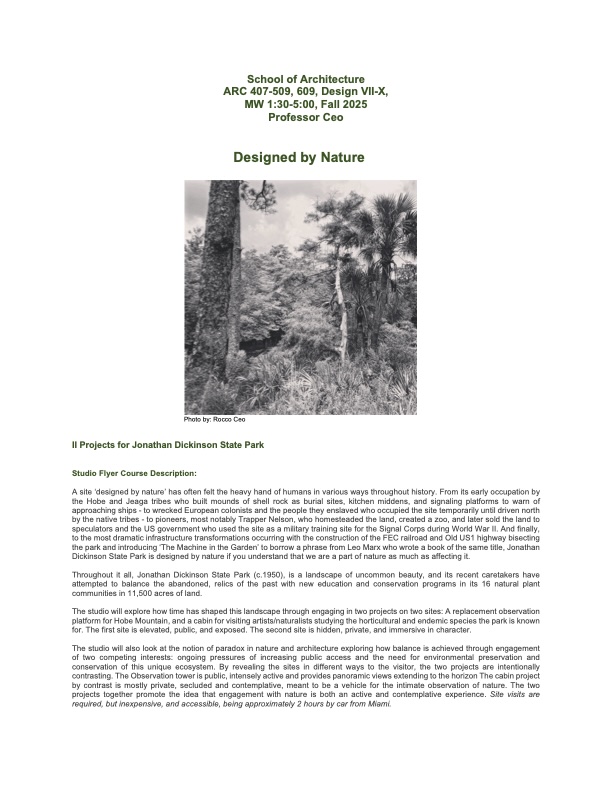 ARC 407-510-609: Designed by Nature A site “designed by nature” has often felt the heavy hand of humans throughout history. From its early occupation by the Hobe and Jeaga tribes—who built shell rock mounds as burial sites, kitchen middens, and signaling platforms to warn of approaching ships—to wrecked European colonists and the people they enslaved, who temporarily occupied the site until driven north by native tribes; to pioneers, most notably Trapper Nelson, who homesteaded the land, created a zoo, and later sold it to speculators and the U.S. government, which used the site as a military training ground for the Signal Corps during World War II. Finally, the most dramatic transformations came with the construction of the FEC Railroad and Old U.S. 1 Highway, bisecting the park and introducing what Leo Marx called “The Machine in the Garden.” Jonathan Dickinson State Park is indeed “designed by nature”—if we understand that humans are as much a part of nature as we are agents of its change. Established in the 1950s, Jonathan Dickinson State Park is a landscape of uncommon beauty. Its caretakers have sought to balance relics of the past with new educational and conservation programs across 16 natural plant communities spanning 11,500 acres. The studio will explore how time has shaped this landscape through two projects on two sites: a replacement observation platform for Hobe Mountain, and a cabin for visiting artists and naturalists studying the park’s horticultural and endemic species. The first site is elevated, public, and exposed; the second is hidden, private, and immersive. Together, they invite students to consider paradox in both nature and architecture—how balance can be achieved between competing interests: the pressures of increasing public access and the need for environmental preservation and conservation. By revealing the sites in different ways to visitors, the projects are intentionally contrasting. The observation tower is public, active, and offers panoramic views extending to the horizon, while the cabin is private, secluded, and contemplative—a vehicle for intimate observation of nature. Together, these two projects promote the idea that engagement with nature is both active and contemplative. Site visits are required but inexpensive and accessible—approximately two hours by car from Miami. Faculty: Rocco Ceo Time: 9:00am-12:00pm Location: Korach Gallery