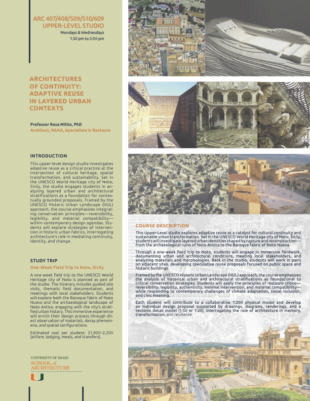ARC 407-510-609: Architectures of Continuity - Adaptive Reuse in Layered Urban Contexts This upper-level design studio investigates adaptive reuse as a critical practice at the intersection of cultural heritage, spatial transformation, and sustainability. Set in the UNESCO World Heritage city of Noto, Sicily, the studio engages students in analyzing the layered urban and architectural stratifications that inform contextually grounded design proposals. Framed by the UNESCO Historic Urban Landscape (HUL) approach, the course emphasizes the integration of conservation principles—reversibility, legibility, and material compatibility—within contemporary architectural practice. Students will explore strategies of intervention in historic urban fabrics, examining architecture’s role in mediating continuity, identity, and change. Faculty: Rosa Milito Time: 9:00am-12:00pm + 1:30pm-5:00pm Location: Korach Gallery South